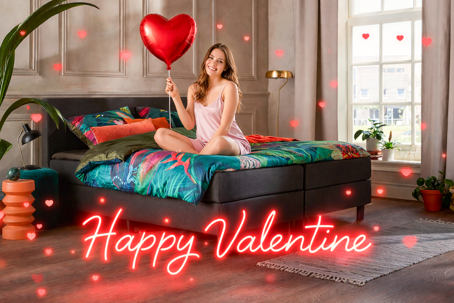 De Valentijnsactie van boxspringset LARA wordt compleet geleverd met harde boxen, stevige pocket binnenveringsmatrassen, een comfortschuim topmatras, een recht hoofdbord en 2 gratis hoofdkussens en een 4-seizoenen dekbed Amber.